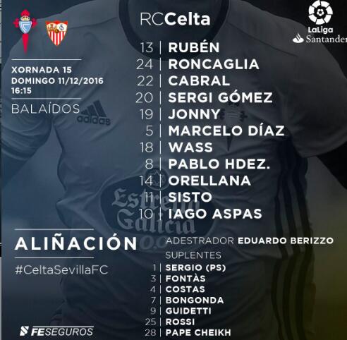 【西甲首发】阿斯帕斯领衔塞尔塔,塞维利亚强阵出击