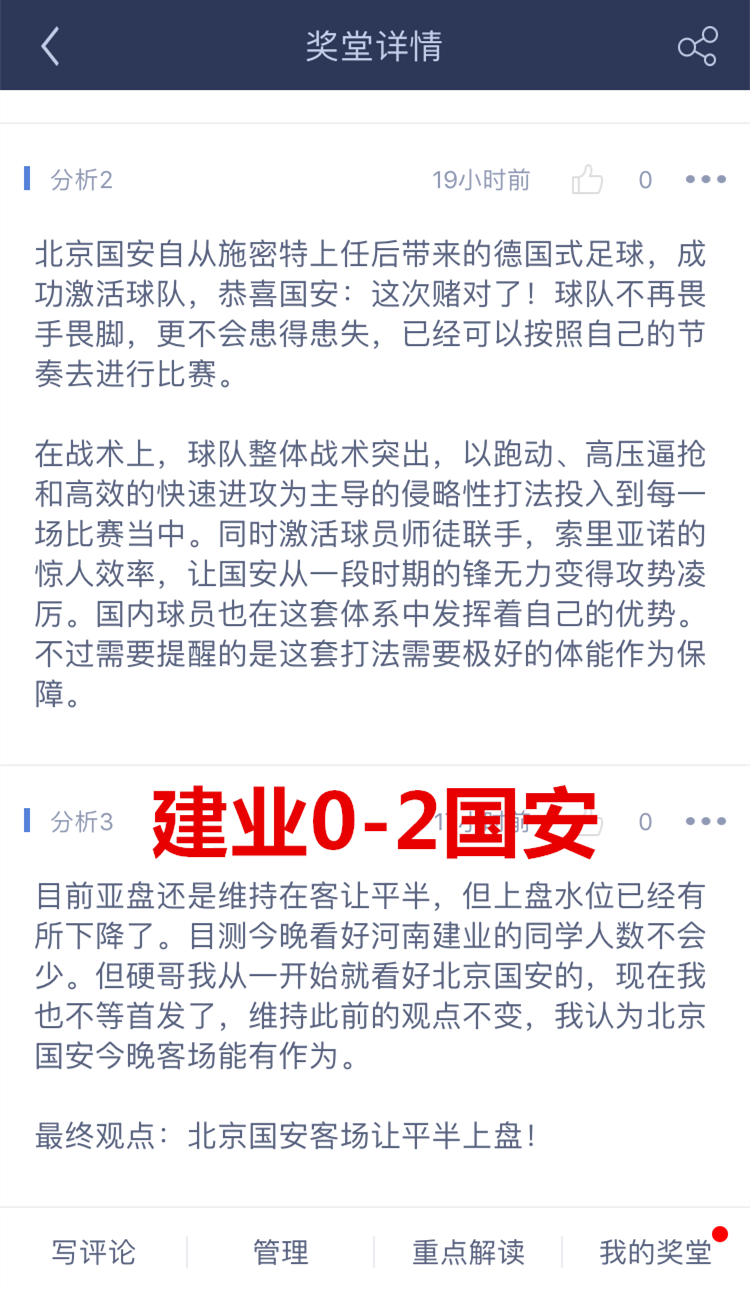 第19轮中超昨晚揭开战幕,客场作战的北京国安2-0完胜河南建业!在国安完成四连胜的同时,我们的奖堂大师【硬料】也悄然完成了中超三连红的佳绩!