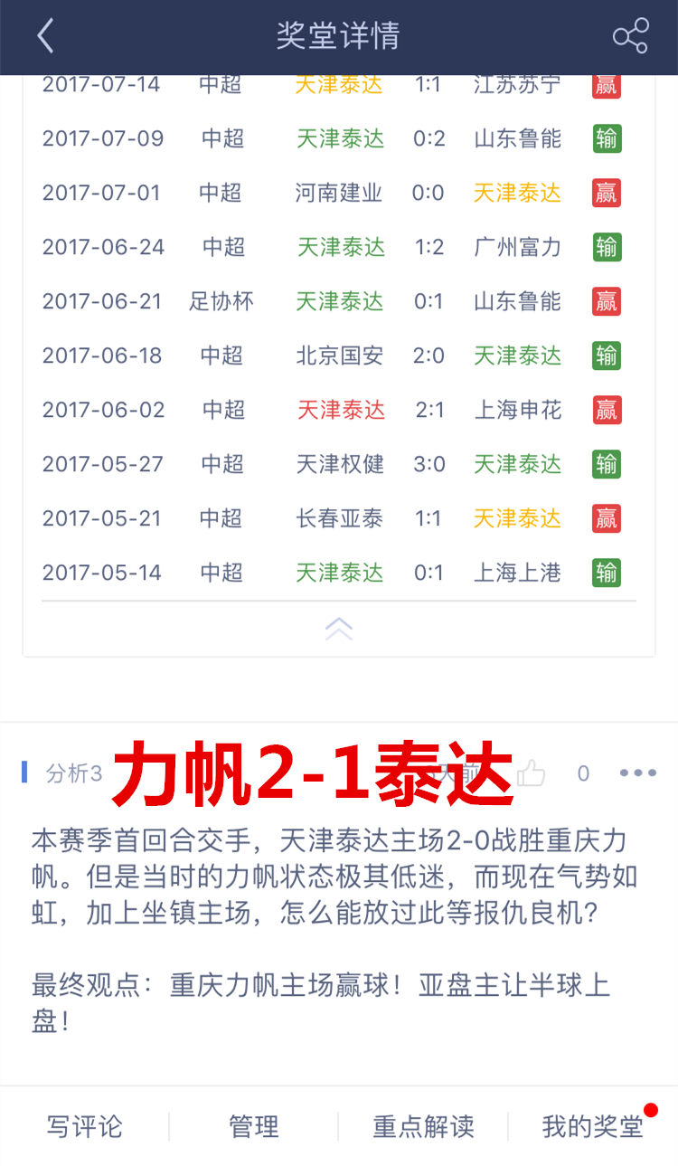 经营足彩十多年的奖堂大师【硬料】擅长利用大数据库的各方数据对比,通过舆情、交锋比例、进球失球时间占比等多项数据综合得出一场比赛的详尽走势。今晚【硬料】再次送上心水解读,中超【重庆力帆VS江苏苏宁】,快点击奖堂一探究竟吧!