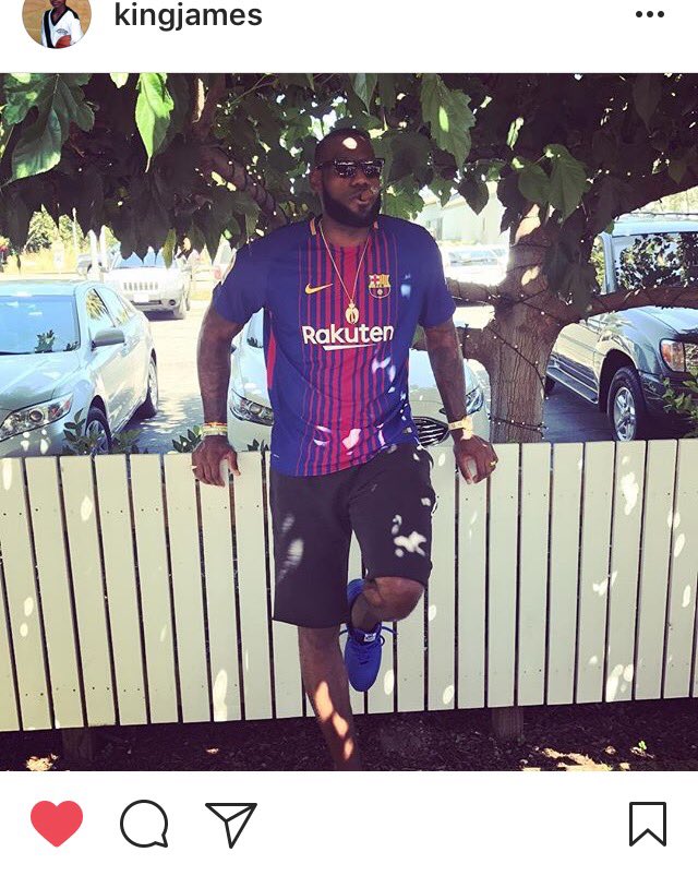 NBA球星詹姆斯晒身穿巴萨球衣图