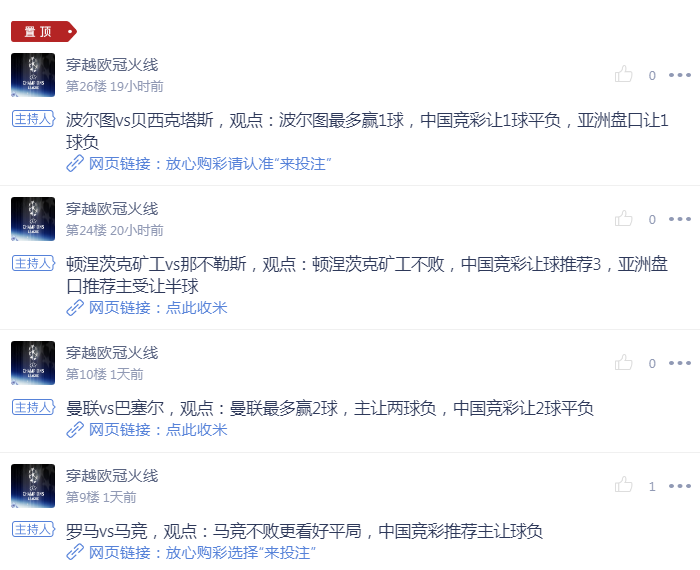 本周新赛季欧冠和欧联正赛正式开打,JRS直播吧奖堂新晋培训团【穿越欧冠火线】充分发挥其在欧洲地区的人脉优势,在欧冠小组赛首轮便斩获4场命中3场的不俗成绩。这四场比赛除曼联下盘未能打出外,其余3场推荐的波尔图让球负、那不勒斯不胜和马竞不败博平均稳稳命中。赶紧让我们来围观一下!