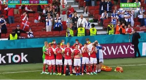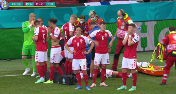 比赛出现在第43分钟,埃里克森突然倒地,而且看上去很不好。随即担架入场,队友们全部围了上来,一起为埃里克森祈祷,比赛暂时中断,所有丹麦球员集体围住埃里克森。此时,队医在和死神抢人……