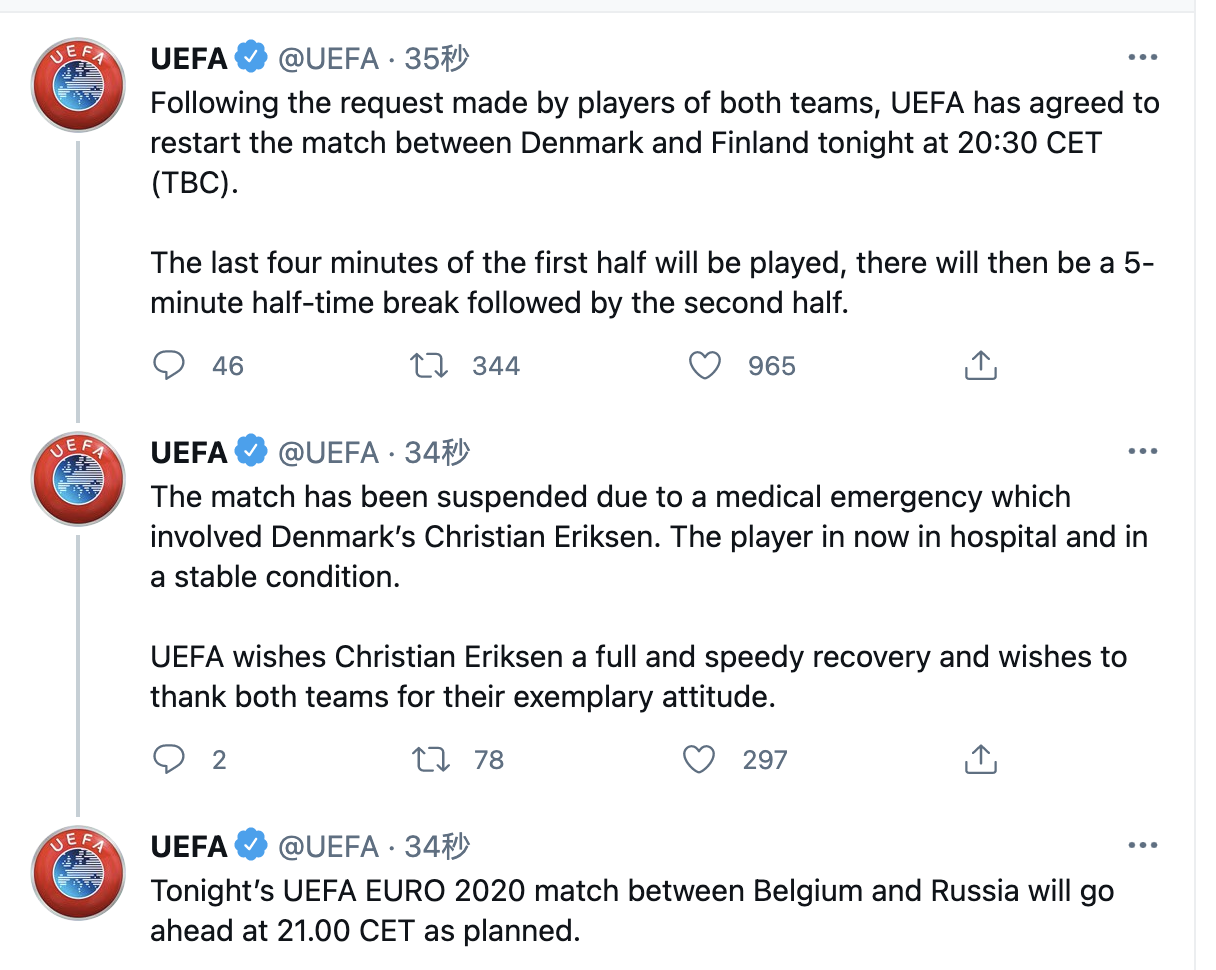 欧足联官方宣布,应两队球员的要求,丹麦vs芬兰的比赛将在北京时间2点30恢复进行。
