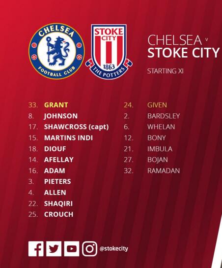 首发人员方面,切尔西本场比赛由法布雷加斯首发登场替换马蒂奇,而威廉也取代了佩德罗获得了首发机会。斯托克城方面,锋线派出了克劳奇搭档迪乌夫和沙奇里的组合,中场则由乔·艾伦、查理·亚当和阿费莱组成。