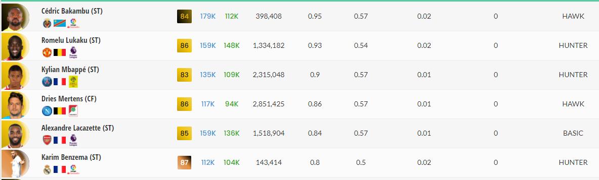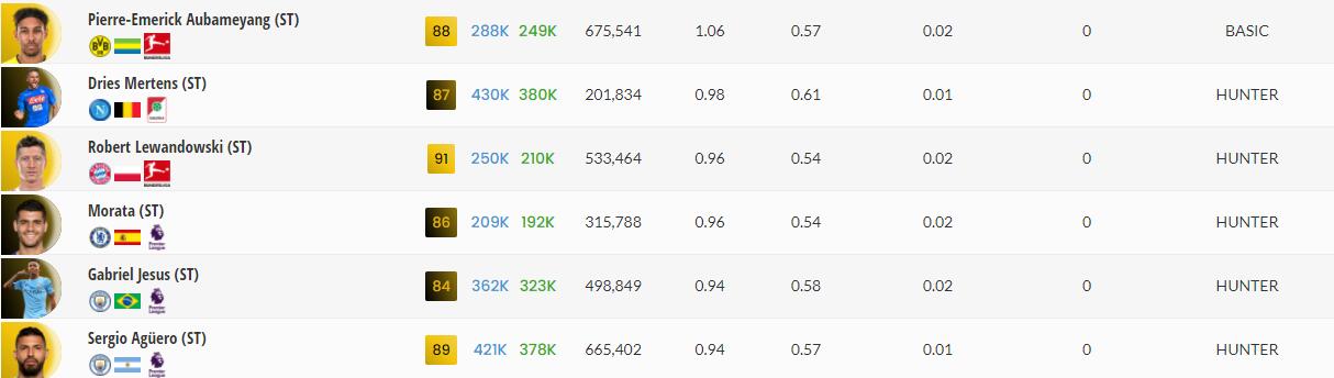 该价位的射手基本是UT中期玩家的长期选择,在数据上具有一定参考价值。从大数据来看蝙蝠射手扎扎、凯恩、卡瓦尼和吉鲁都具备了较高的进球率。这些前锋速度上并非上乘,但是扎扎有身体、凯恩有跑位和射术、吉鲁能作球。从风格上来看那些能抗、能射的前锋丰富了玩家的战术,同样可以做到进球如麻。