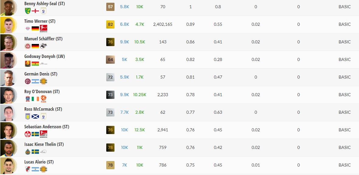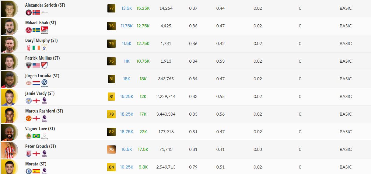 UT中前期玩家在资金上有了一定富足,10000-20000球员或许是他们打单机周赛或者线上的选择。从样本数据超过200万场的球员来看瓦尔迪和拉师傅效率都不错,莫拉塔偏低。而从实际手感来说瓦尔迪和拉师傅的速度和跑位确实是也是该价位的不二之选。莫拉塔由于速度的关系,在进球率上偏低(大部分新手玩家还是更能用好速度型射手)。