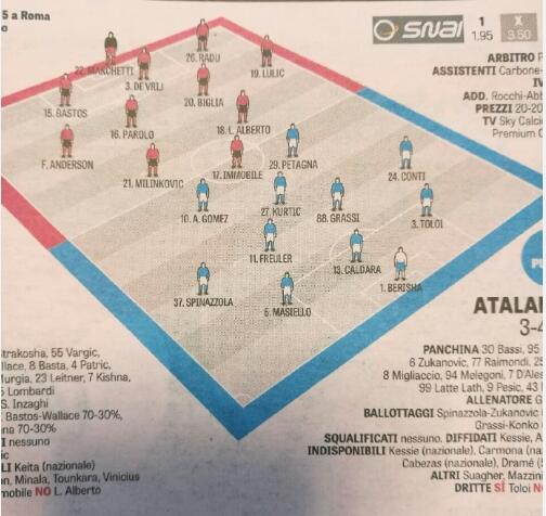 拉齐奥中场大将凯塔的离开可能会让主帅小因扎吉改变阵型,3后卫是一个可以兼具多方的阵型,德弗莱和拉杜铁定首发,另一个位置会在巴斯塔和巴斯托斯之间做一个选择,也有可能两人同时上场,阵型3421,安德森和米林双前腰,巴斯塔和卢利奇两边前卫,帕罗洛和比格利亚中场,如果安德森后撤任右边前卫,那么阿尔贝托很可能得到另一次首发机会出任前腰。