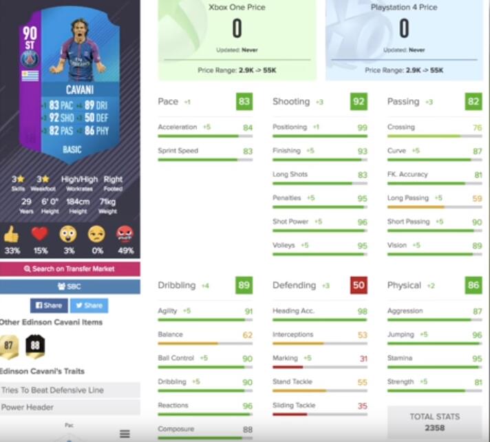 卡瓦尼的总评达到了惊人的90,在使用猎人卡后速度、身体、弹跳、头球都达到了很强的水准。