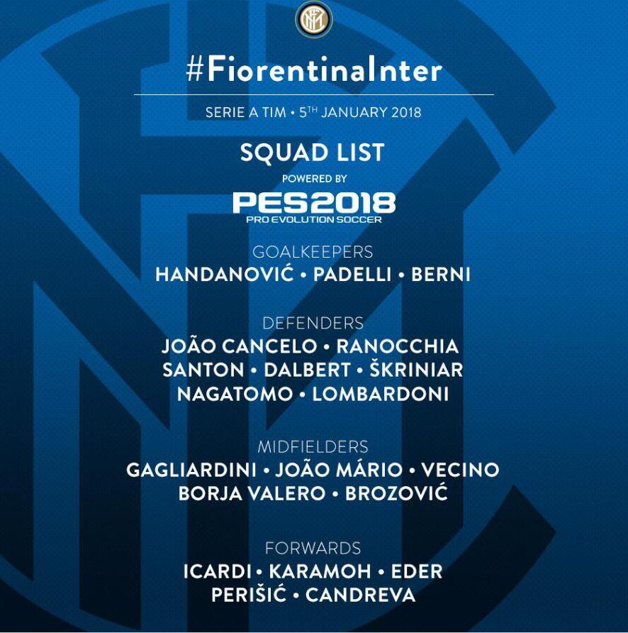 国米客战佛罗伦萨大名单:米兰达、丹布因伤缺阵