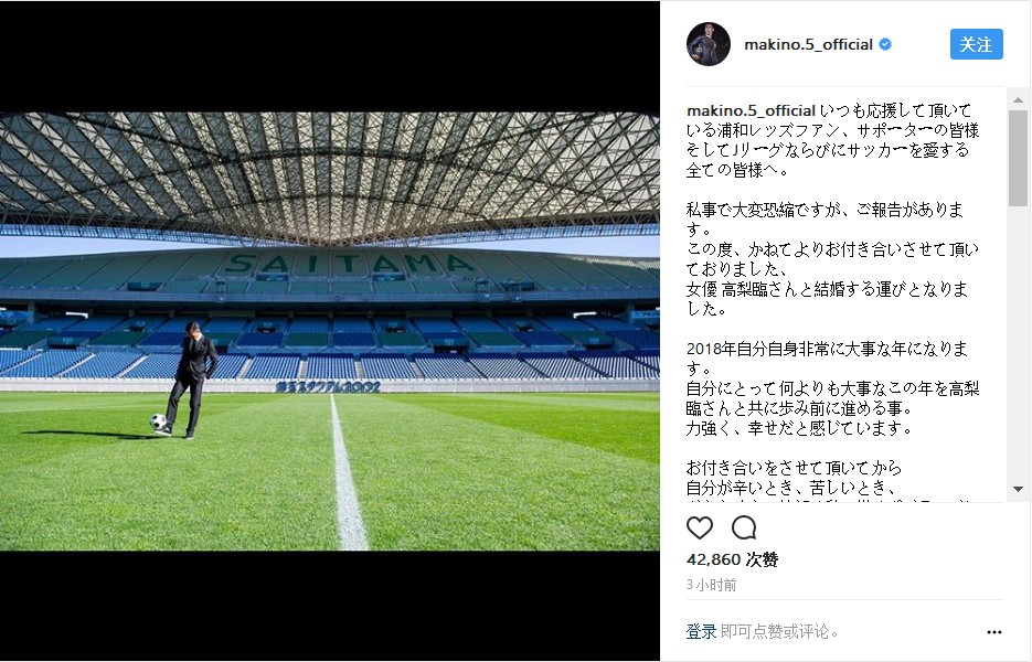 JRS直播讯,近日,目前效力于浦和红钻的日本国脚槙野智章在自己的INS上宣布了自己与女演员高梨临结婚的消息。