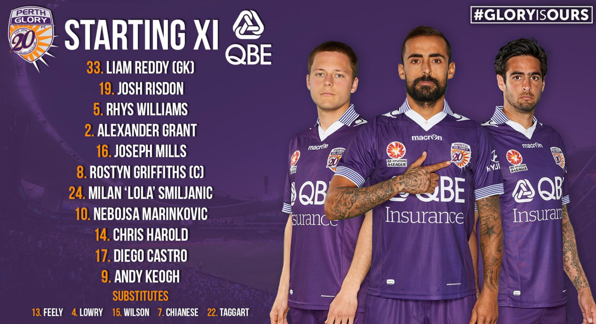 珀斯光荣本场首发跟上轮相比没有任何变化,将延续4-4-2阵型。卡斯特罗和科恩领衔锋线,罗伊斯顿和斯米尔贾尼奇坐镇中场,两边是马林科维奇和哈罗德,如果科恩本场进球,他将追平Shane Smeltz成为珀斯历史并列第1射手。