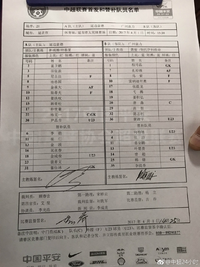 今日15:30,延边富德将坐镇主场迎战广州富力队。本场双方首发已出,深陷风波的姜至鹏首发位置被张晨龙代替。