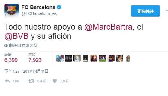 当时正在更新比赛讯息的巴萨官推也插播了对大黄蜂的支持:给予巴尔特拉和多特蒙德我们全部的支持。