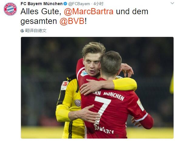拜仁官推发文称:一切顺利,巴尔特拉和整个大黄蜂!