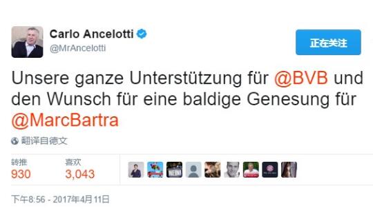 拜仁主帅安切洛蒂也表示:给予多特我们全部的支持,希望巴尔特拉早日康复。