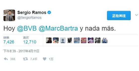在慕尼黑等待比赛的拉莫斯也发推:今天,多特蒙德和巴尔特拉,没有其他。